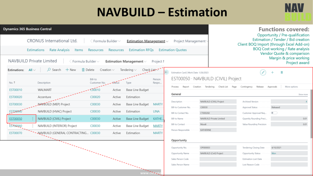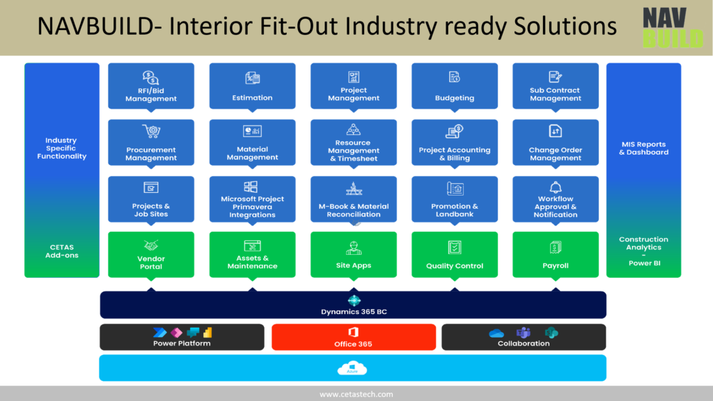 NAVBUILD is a suite of industry-specific add-ons for Business Central Solutions designed for Engineering and Construction Industry. Built on the powerful Microsoft Dynamics 365 Business Central platform, NAVBUILD provides you with a comprehensive set of features, functionalities & tools to streamline business processes, enhance productivity, and maximize profits by providing real-time visibility into project operations and financials.