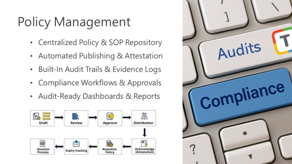 This feature is particularly valuable for companies preparing for ISO certifications, SOC audits, HIPAA compliance, or municipal governance requirements, where maintaining verifiable proof of compliance is mandatory.